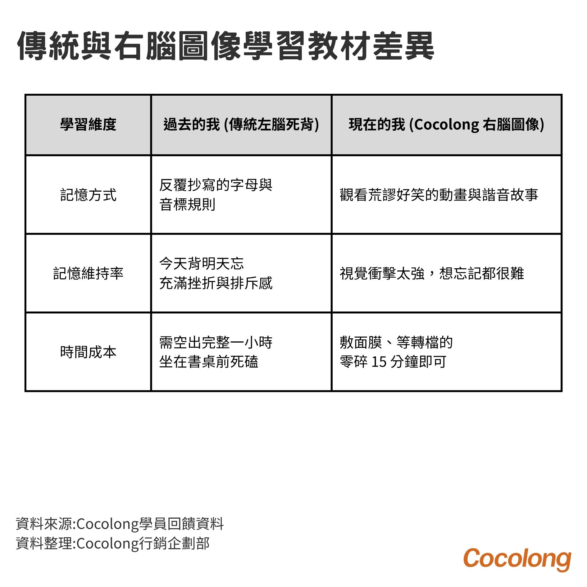 後來,同行朋友強烈推薦我試試 Cocolong 的右腦圖像學英文。她說用這套教材自學英文能夠用看的就學會取代原本硬記英文的方式,且記憶時間久又深刻,我特別整理了這套教材與我過去學習方式的差異: